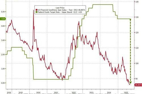 What makes this even more surreal is that financial conditions, by Goldman’s measure, are already the loosest on record. Powell is being asked to open a tap when the basin is already flooded.
