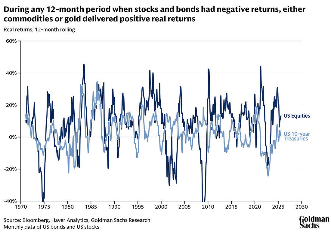 Goldman Sachs Research analyst Lina Thomas notes that in every 12-month stretch where both equities and bonds posted negative real returns, either commodities or gold managed to generate positive performance. The pattern highlights how commodities can serve as a crucial diversifier, especially in environments defined by slower growth and persistent inflation risk.