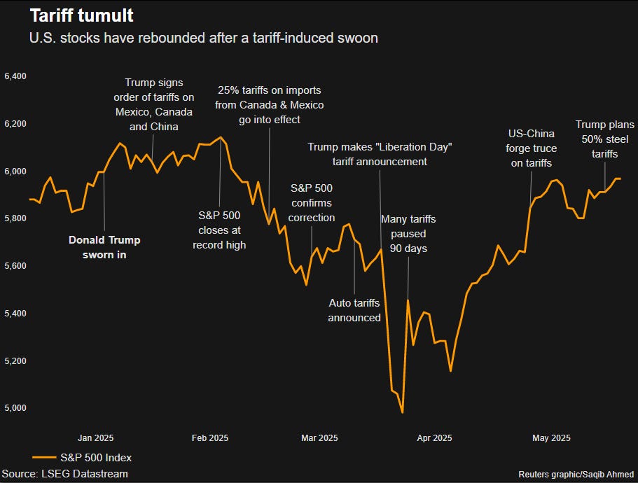 The first chart illustrates the extent of tariff-related turmoil the S&P 500 has navigated since President Trump took office. In many ways, it's remarkable that the index is up for the year.