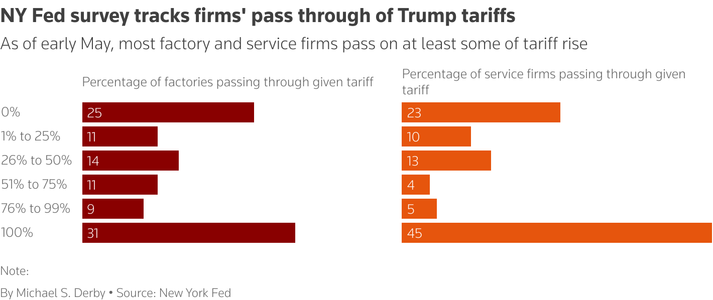 The second is based on a New York Fed survey published this week, which shows how U.S. firms are passing on price increases to their customers. Most strikingly, almost half of the services companies are passing on 100% of the tariffs.