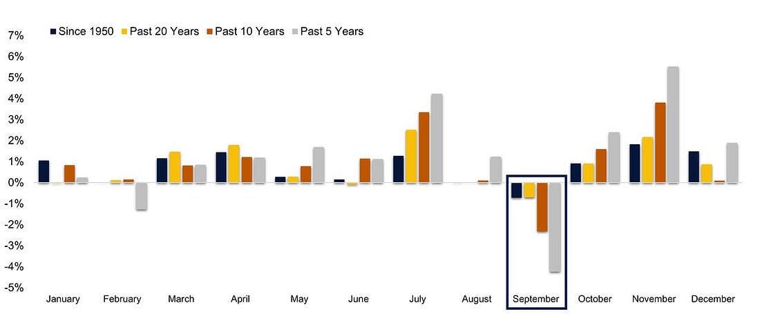 So we enter September with stocks priced for perfection, breadth narrowing, vol asleep, and macro carrying enough contradictions to keep traders second-guessing. Dip buyers may win the next skirmish, but the calendar itself is a foe — the S&P has fallen in 56% of Septembers since 1927, with an average loss over 1%. Seasonals alone don’t topple markets, but they do add grease to the downhill slope. For now, August closes with bonds and gold as the month’s heroes, stocks as the reluctant laggard, and AI shifting from pure rocket fuel to something that looks more like heavy ballast.