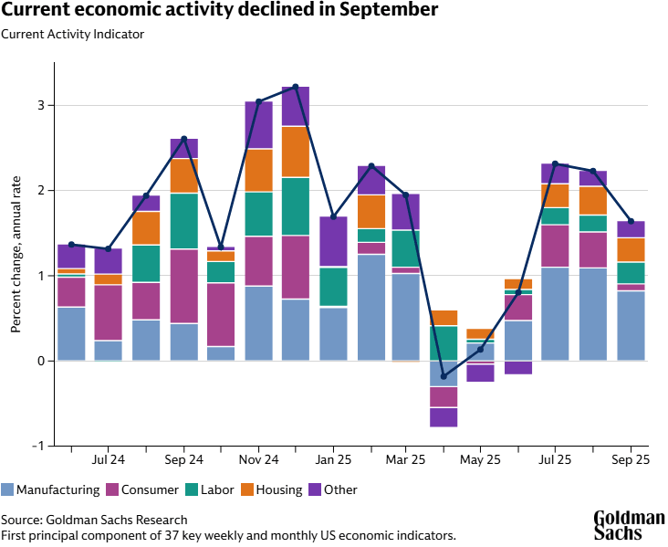 Some US economic data have been unavailable this month because of the US government shutdown. One proprietary indicator from Goldman Sachs Research has fallen recently.