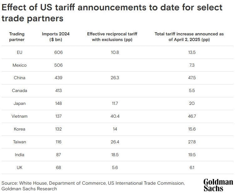 The tariff tidal wave keeps rising. According to Goldman Sachs Research, the cumulative impact of this week’s “reciprocal” tariffs — combined with earlier measures announced year-to-date — could drive the U.S. effective tariff rate up by 18.8 percentage points, blowing past prior estimates. In a note dated April 2, Alec Phillips and Elsie Peng acknowledge that eventual negotiations may water down some of the headline rates, but the risk of further retaliation, sector-specific escalation, and hardening trade rhetoric means the final impact could land well above the 15ppt increase Goldman had previously modeled.