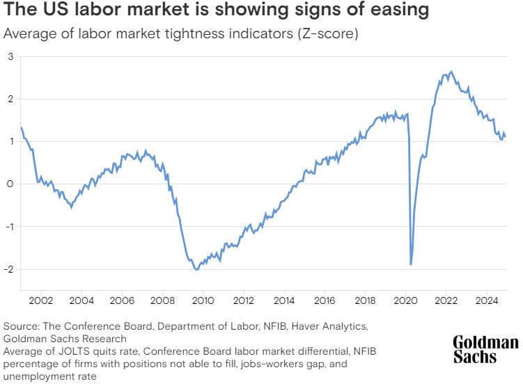Jan Hatzius from Goldman Sachs describes the current job market with a "Goldilocks flavor," indicating that it's balanced enough not to risk overheating. He characterizes it as a "low-hiring / low-firing" environment, suggesting stability rather than turbulence. Goldman Sachs Research has developed a composite measure of labor market tightness, which includes factors like unemployment, job openings, quits, and perceptions of market conditions by firms and workers. This measure has stabilized at a level that is below what was observed during the 2018-2019 period when inflation hovered just below the Federal Reserve's target. Hatzius notes that given the 1.5-2% productivity trend observed over the past five years, the deceleration of wage inflation into the 3.5-4% range aligns well with maintaining a 2% price inflation rate, supporting a balanced economic approach without excessive pressure on inflation.