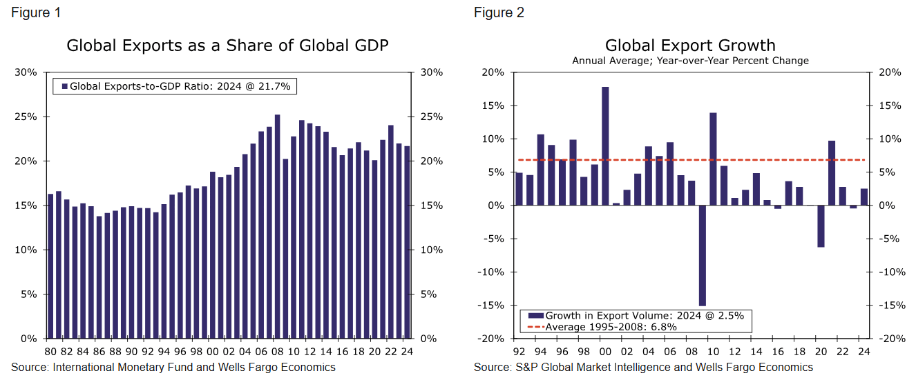 Many observers consider the 1990s and the first decade of the 21st century to be the heyday of the most recent era of globalization.1 The ratio of global exports to global GDP, which had been trendless around 15% between 1980 and the mid-1990s, rose steadily to 25% by 2008 (Figure 1). In real (i.e. volume) terms, global exports grew at an average rate of nearly 7% per annum between 1995 and 2008, nearly twice as fast as the 3.9% per annum real GDP growth rate that the global economy averaged during that period (Figure 2). Robust growth in export volumes was due, at least in part, to the strength in the global economy in the 90s and the early years of the 21st century.