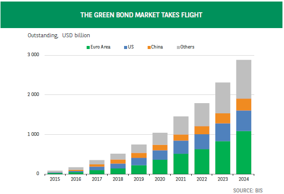 However, the geopolitical backdrop of the war in Ukraine, the rearmament race and Donald Trump’s return to business raises questions about whether this expansion can continue. Is there not a risk that governments’ backlash against climate and environmental issues will stop the previously promising green bond market in its tracks? In our view, this is unlikely, as sustainable finance is set to play an increasingly important role in the future, for at least three reasons.