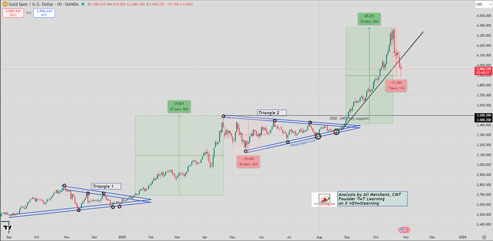 · The first triangle formed around September 2024, followed by a breakout in January 2025, triggering a 30% rally over 67 trading days before a consolidation phase began.