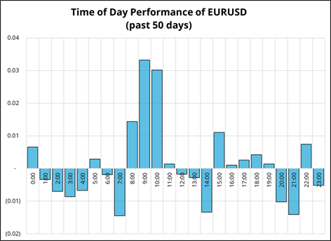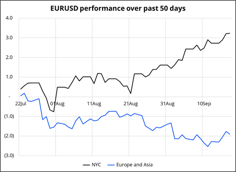 If you recall, in April and May, gold and EURUSD went up almost every day in Asia. Now, it’s the opposite, as you can see here: