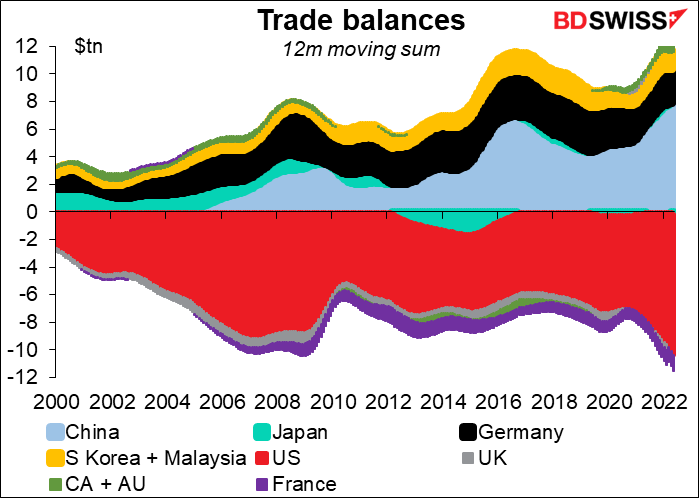 How does that work? Most people think of trade surpluses & deficits in the following way. The hard-working Germans who make excellent cars are the source of that country’s trade surplus (which we learned on Monday has disappeared, but never mind) while the spendthrift Americans, borrowing and spending money they don’t have, are the source of the perennial US trade deficit. This is the logic that says tariffs, market access agreements, and urging Americans to work harder and save more are the way to rectify these global imbalances.