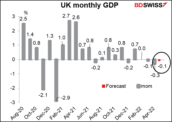 Wednesday is also “UK short-term indicator day” when the UK releases monthly GDP, industrial & manufacturing production, and the trade balance. The most important of these indicators, in my point of view, is the UK GDP. It’s expected to be down for the third month in a row. This will bring into sharp relief the conundrum the Bank of England faces as inflation soars while the economy crawls toward recession.