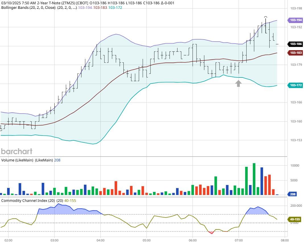 Yesterday the ZT Migrated Higher at around 8 AM EST with no economic news in sight. The Dow moved Lower at the same time. Look at the charts below and you'll see a pattern for both assets. The Dow moved Lower at 8 AM EST and the ZT moved Higher at around the same time. These charts represent the newest version of Bar Charts, and I've changed the timeframe to a 15-minute chart to display better. This represented a Long opportunity on the 2-year note, as a trader you could have netted about 30 plus ticks per contract on this trade. Each tick is worth $7.625. Please note: the front month for ZT is now Jun '25 and the Dow is still Mar '25. I've changed the format to filled Candlesticks (not hollow) such that it may be more apparent and visible.