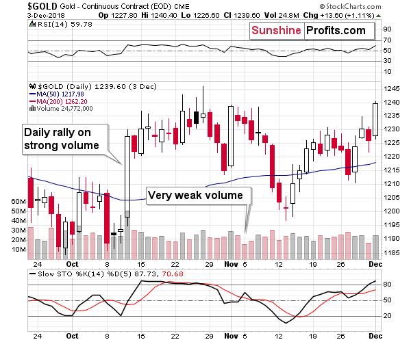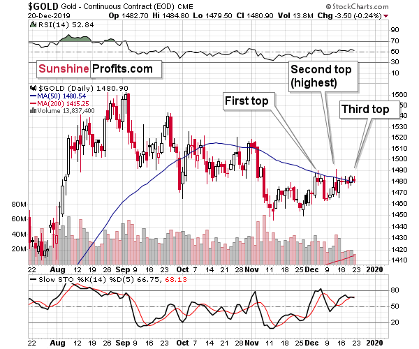 Both patterns started with a sizable daily rally in gold that took place on big volume (October 2018 and early December 2019). Then gold entered consolidation with a small breakout that was then invalidated. Gold recovered and went on to make the third attempt to break higher, but failed. What’s notable about these final attempts is that we saw a day with very low volume (early November 2018, and the last few days). Back in 2018, this pattern was followed by several days of visibly lower prices before gold rallied.