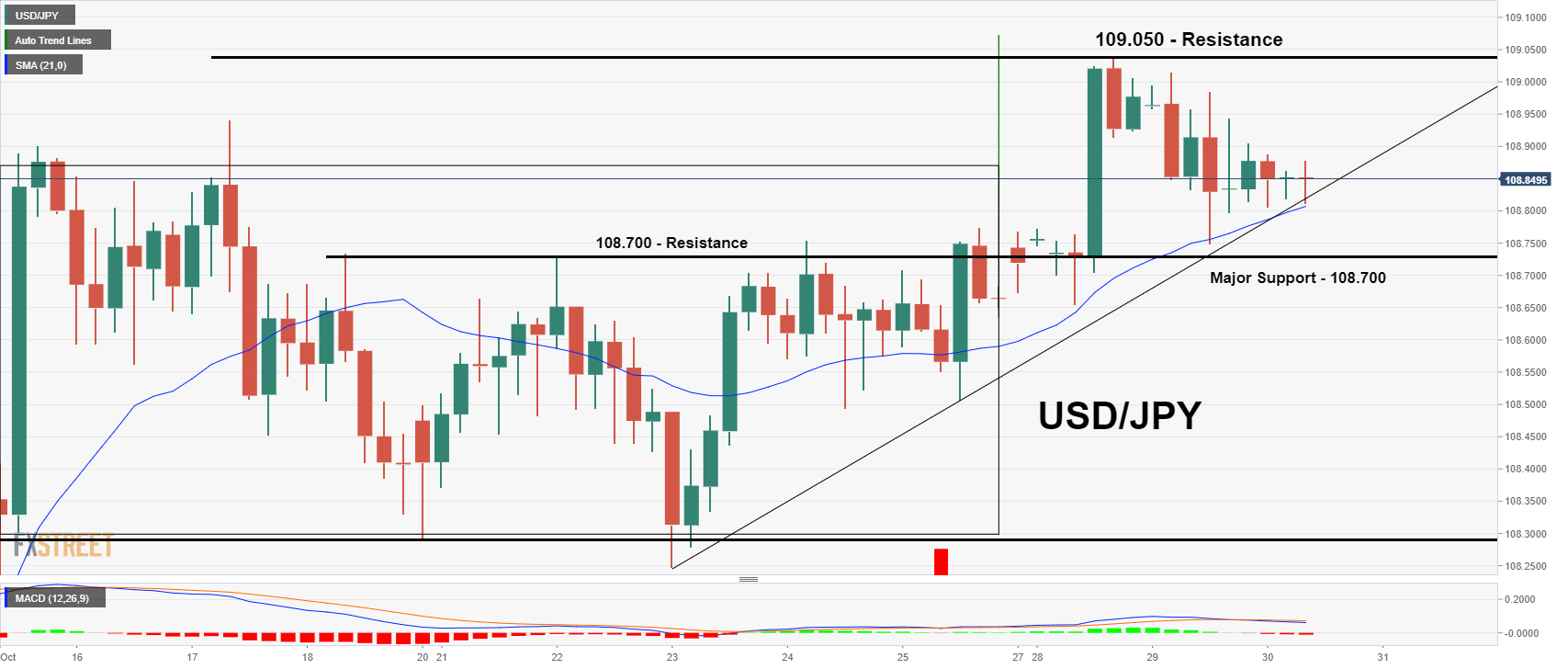 The MACD and RSI are suggesting neutral bias, but the 108.700 level may trigger a bullish trend in the USD/JPY.