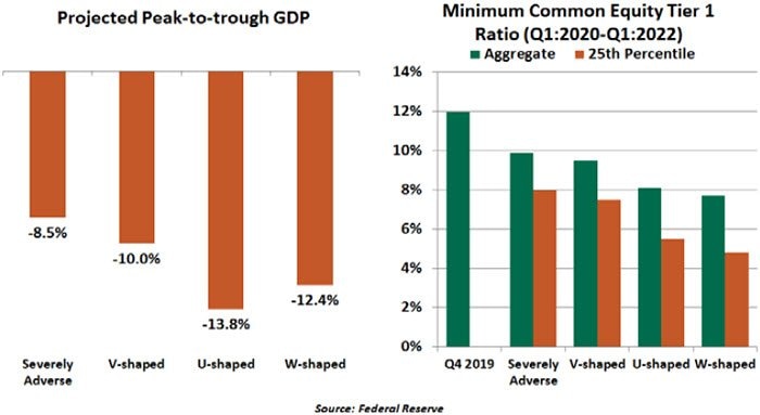 It wasn’t a surprise to see that most firms under the “normal” stress scenario would remain well capitalized. The regulatory requirements for higher capital levels imposed after the 2008 financial crisis have bolstered the banking system’s resiliency. But the Fed went further, performing additional tests under hypothetical downside scenarios, characterized by recovery paths in the shapes of the letters V, U and W.