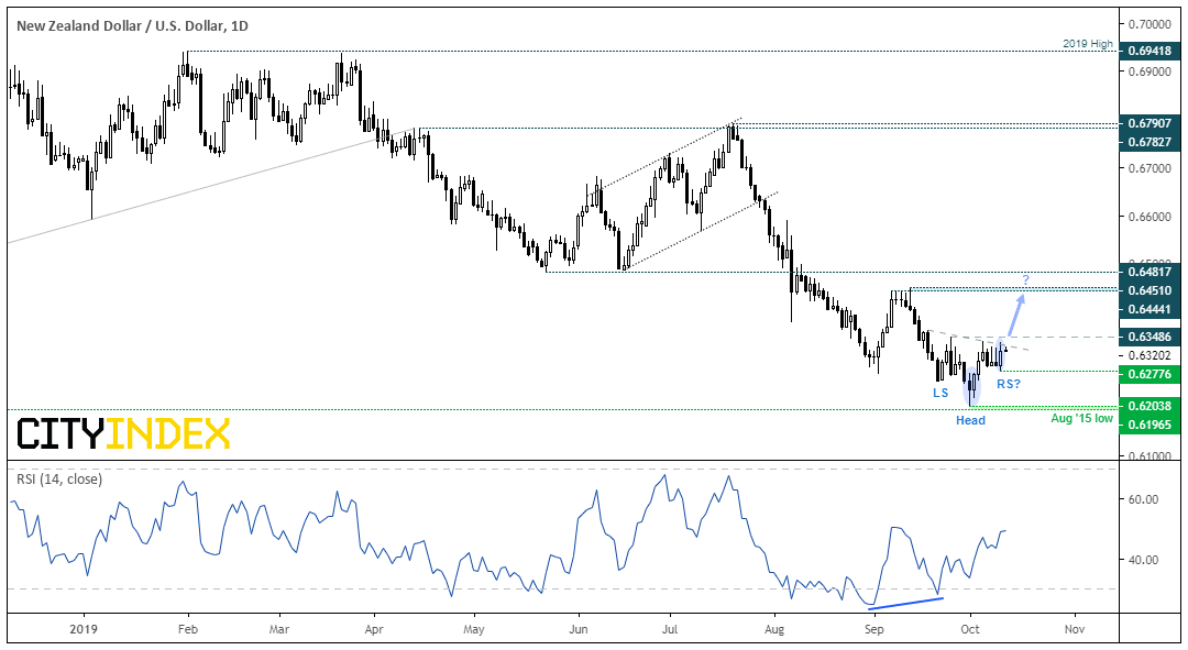 On the 1st of October, NZD/USD found itself at a 4-year low. Yet it’s failure to test the August 2015 low produced a spinning top doji just above key support, and the subsequent bullish engulfing candle provided a two-bear reversal pattern. Not only did this coincide with a bullish divergence with the RSI, but the -bar reversal pattern could be the ‘head’ of an inverted head and shoulders pattern. Yesterday’s bullish engulfing candle suggests the right shoulder (RS) is being formed so, if we’re to see a break above the neckline, we’d assume the bullish reversal pattern to be confirmed.