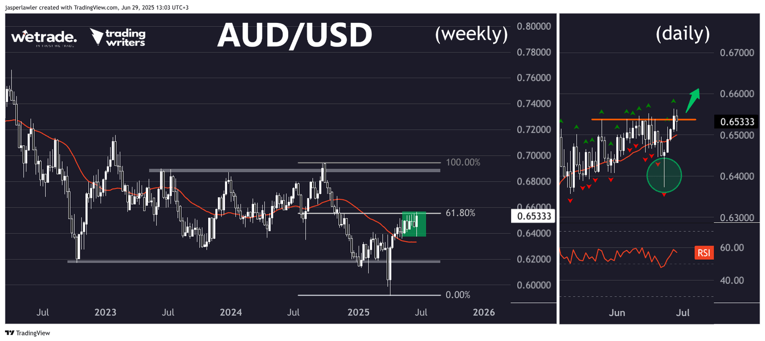 A false breakdown below 0.64 triggered a hammer reversal on the daily chart, which eventually triggered a breakout of the prior highs just above 0.65. While over 0.65 we’d expect a continuation move higher.