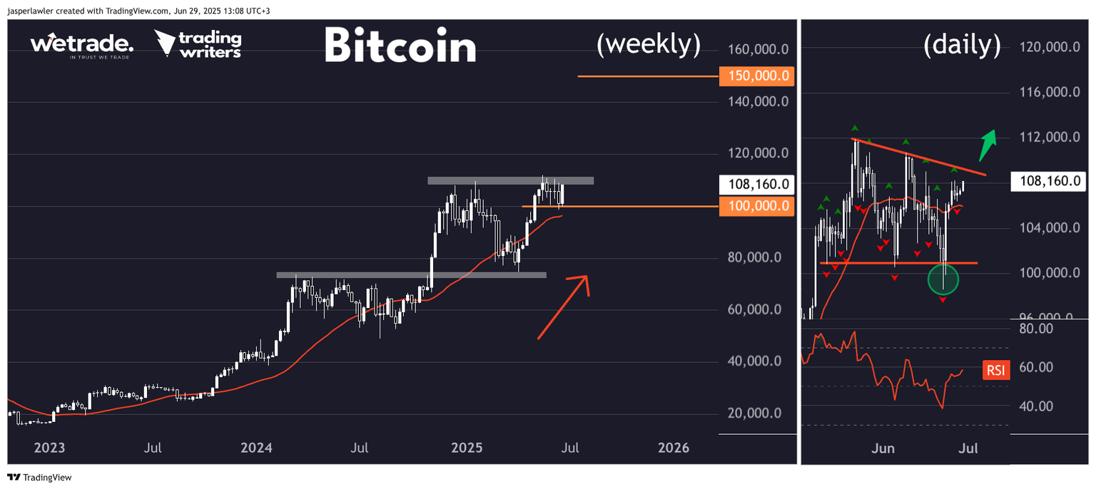 The false break below $100k is more clearly seen on the daily chart with a follow-through surge over $108K to re-test down-sloping resistance through the previous two peaks.