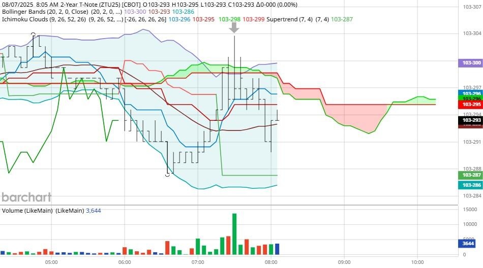 Yesterday the ZT dived Lower at around 8:30 AM EST with Unemployment Claims news pending. The Dow climbed Higher at the same time. Look at the charts below and you'll see a pattern for both assets. The Dow climbed Higher at around 8:30 AM EST and the ZT dived Lower at around the same time. These charts represent the newest version of Bar Charts, and I've changed the timeframe to a 15-minute chart to display better. This represented a Short opportunity on the 2-year note, as a trader you could have netted about a dozen ticks per contract on this trade. Each tick is worth $6.25. Please note: the front month for ZT is now Sep '25 and the Dow is now Sep '25. I've changed the format to filled Candlesticks (not hollow) such that it may be more apparent and visible.