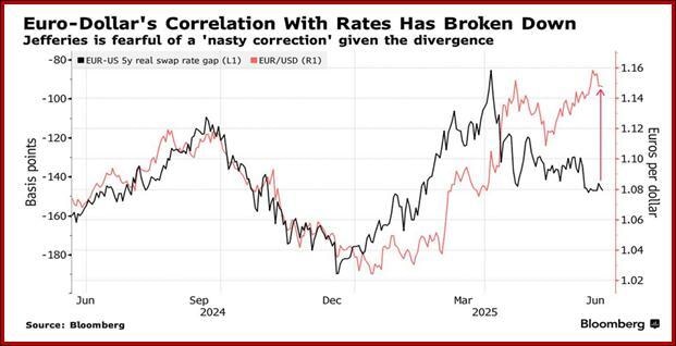 Important tidbit: Yesterday Bloomberg had a story titled “Misfiring Models Leave Wall Street Currency Traders Flying Blind.” The article names multiple FX trading forms complaining that the usual strategies, like interest rate differentials, are no longer working. The dollar “should” be strong because it has higher rates than everybody else, and the euro should be soft because of the multiple rate cuts, but it ain’t happening. See the chart. See also our chart of the yen vs. the 10-year and vs. the dollar index in the Chart Package.