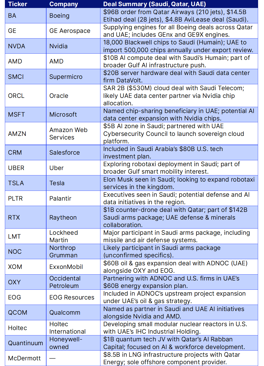 - Boeing, Nvidia, GE, and Raytheon emerged as major winners, securing multi-billion-dollar orders across Qatar, Saudi Arabia, and the UAE, while tech giants like Microsoft, Oracle, and Amazon gained cloud and AI infrastructure footholds.
