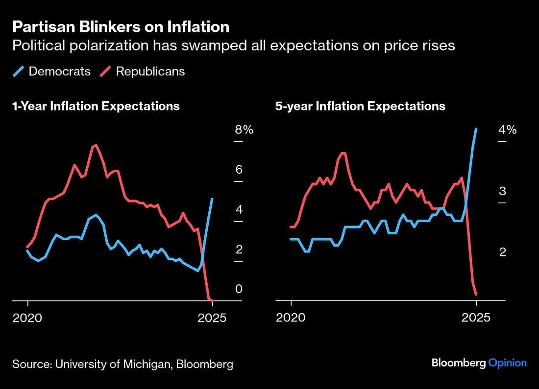 Take inflation expectations. The average Republican now thinks inflation will be close to zero over the next 12 months, while the average Democrat is bracing for price hikes north of 5%. That’s not just a difference in perspective—that’s two entirely different realities. The swing in longer-term inflation expectations is even more extreme, making it painfully clear that macro sentiment has become completely unhinged from actual economic conditions.