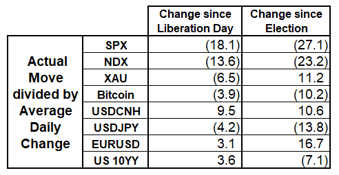 Here are the moves since election day and Liberation Day. Stocks obviously the big victims of the improvisational policy mix while EURCNH has gone to the moon. If this was an attempt to drive bond yields lower, it did not work. The calculation is (move divided by average day range). So SPX is down 22% and average day range is 0.9% = -23.2.