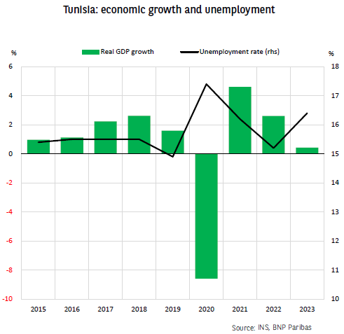 Tunisia is going through a serious economic crisis. Real GDP contracted again in the fourth quarter, falling by 0.2% year-on-year after a decline of 0.3% in the previous quarter. Estimates suggest that full-year growth was 0.4%, its lowest level for more than a decade (barring the Covid crisis). As a result, the unemployment rate is now 16.4%, up from 15.2% at the end of 2022 and 1.5 points more than its pre-pandemic level. Worryingly, youth employment is running at 40.9%.