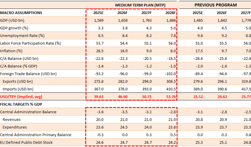 The plan revised GDP growth forecasts downward by 0.7ppt for each year from 2025 to 2027. Nonetheless, the government expects growth to accelerate from 3.3% in 2025 to 5% by 2028. The official projection of 3.3% for this year is more optimistic than the 2.9% consensus in the latest Market Participants Survey, while the 2026 forecast is broadly in line with the market’s 3.7% expectation. Still, the growth trajectory outlined in the MTP remains below Turkey’s long-term average, signalling that policymakers are prioritising disinflation over rapid expansion.