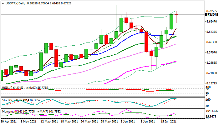 The USDTRY advanced 4% this week and approached new record high at 8.7536, posted on June 2, Fed’s signals of stimulus tapering and rate hikes, probably earlier than expected, strongly boosted dollar.