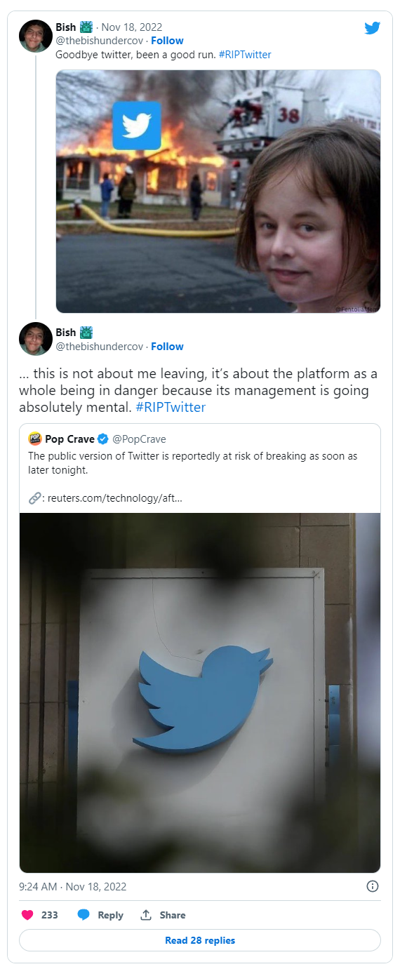 Multiple teams that were critical for keeping the service up and running are completely gone, or borrowing engineers from other groups, according to people familiar with the matter. That includes infrastructure teams to keep the main feed operational and maintain tweet databases. #RIPTwitter trended on the site, as users and departed employees predicted an imminent shutdown and said their goodbyes.