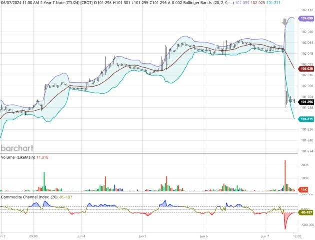 On Friday the ZT migrated Lower at around 8:30 AM EST after the Jobs numbers were released. If you look at the charts below the ZT gave a signal at around 8:30 AM and started its Downward slide. Look at the charts below and you'll see a pattern for both assets. The Dow moved Higher at around 8:30 AM and the ZT moved Lower at around the same time. These charts represent the newest version of Barcharts and I've changed the timeframe to a 15-minute chart to display better. This represented a Short opportunity on the 2-year note, as a trader you could have netted about 20 plus ticks per contract on this trade. Each tick is worth $7.625. Please note: the front month for both the ZT is Sept and the S&P is still Jun '24. I've changed the format to filled Candlesticks (not hollow) such that it may be more apparent and visible.