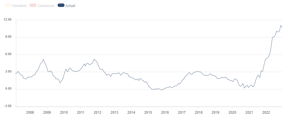 In November, the UK Consumer Price Index fell more sharply than expected to 10.7% from October's 41-year peak of 11.1%, motivating the Bank of England (BoE) to hike the key policy rate by 50 basis points (bps) to 3.50%.