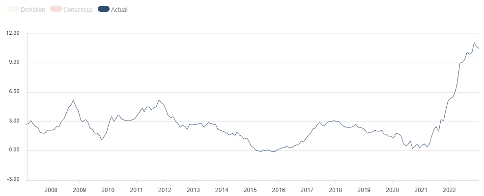 The January month annualized UK Consumer Price Index (CPI) data is expected to drop to 10.3%, moving further away from a peak of 11.1% seen in October and down from December’s 10.5%. The inter-month CPI is also seen falling by 0.4%. The annualized core inflation rate is likely to edge a tad lower to 6.2% vs. 6.3% reported in December. Despite the continued deceleration in the UK headline inflation, the figure is likely to have stayed above the 10.0% level last month.
