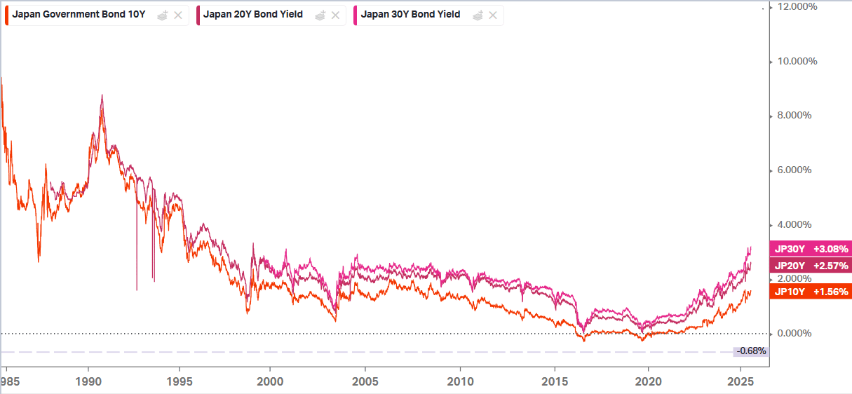One of the biggest stories getting little coverage at the moment is the rising Japanese bond yields. The 30-year is over 3%; if you think the US has a debt problem, try Japan’s 235% debt-to-GDP. What could possibly go wrong?
