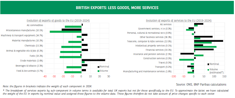 The European Union: a key market. Due to its geographical proximity, the EU remains by far the main destination for British goods, accounting for 47% of total merchandise exports (by value) in 2024; this share has remained broadly stable since 2019. Exports in volume to the EU have fallen significantly since 2019 (left chart), as have those to the rest of the world. This trend partly reflects a ‘Brexit effect’, linked to the higher cost of imports from the EU, but not only: it also reflects the wider structural loss of competitiveness of British industry in the face of competition from outside Europe, particularly from Asia. The slight increase in nominal exports to the EU reflects a price effect only. The decline in volume between 2019 and 2024 (-18% overall) affected almost all segments; the biggest export items, machinery and equipment and fuels (and derivatives) fell by 5.3% and 24% respectively.