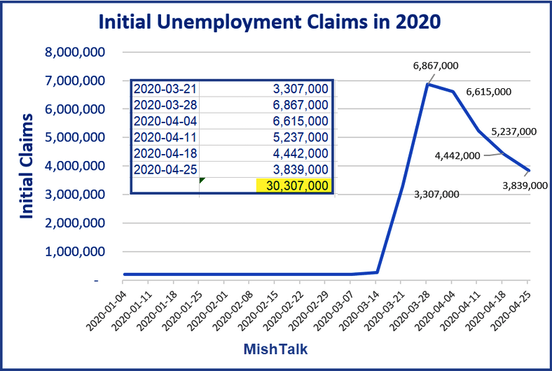 - That makes the six-week running total a whopping 30.307 million unemployment claims.