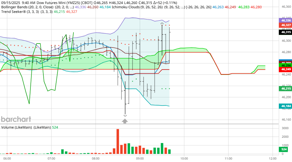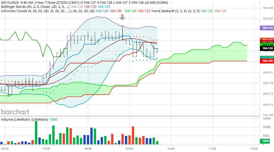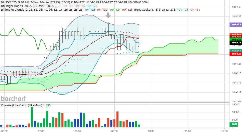 Yesterday the ZT dived Lower at around 8:30 AM EST with no data pending. The Dow climbed Higher at the same time. Look at the charts below and you'll see a pattern for both assets. The Dow climbed Higher at around 8:30 AM EST and the ZT dived Lower at around the same time. These charts represent the newest version of Bar Charts, and I've changed the timeframe to a 15-minute chart to display better. This represented a Short opportunity on the 2-year note, as a trader you could have netted about a dozen ticks per contract on this trade. Each tick is worth $6.25. Please note: the front month for ZT is now Dec '25 and the Dow is still Sep '25. I've changed the format to filled Candlesticks (not hollow) such that it may be more apparent and visible.