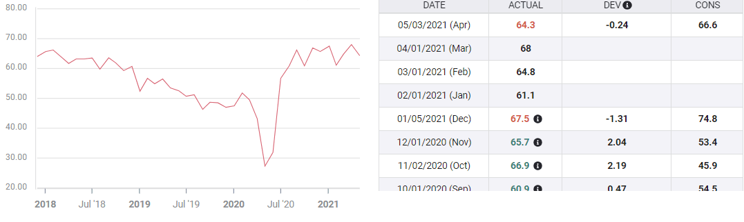 In April, the overall index had been expected to move up to 65 from 64.7 and employment was predicted to edge to 61.5 from 59.6. The New Orders Index was projected to fall slightly from 68 to 66.6, as parts and raw material supply constraints cut into manufacturing output.