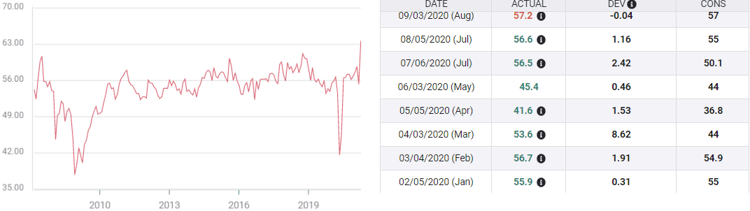 The overall index is expected to rise to 64.3 from 63.7. Employment is forecast to fall to 55 from 57.2 and new orders is projected to plunge from 67.2, its all-time record, to 56.6.
