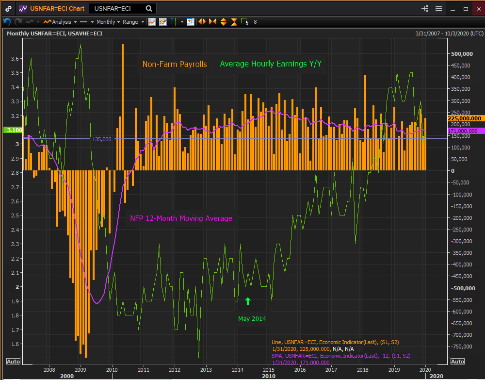 Payrolls moderated in 2019 with the 12-month moving average for the national NFP falling from 235,000 in January to 174,000 in December and ADP’s private accounting dropping from 222,000 to 163,000. Both were surprisingly robust in January with ADP at 291,000 its strongest month in a year and NFP at 225,000.
