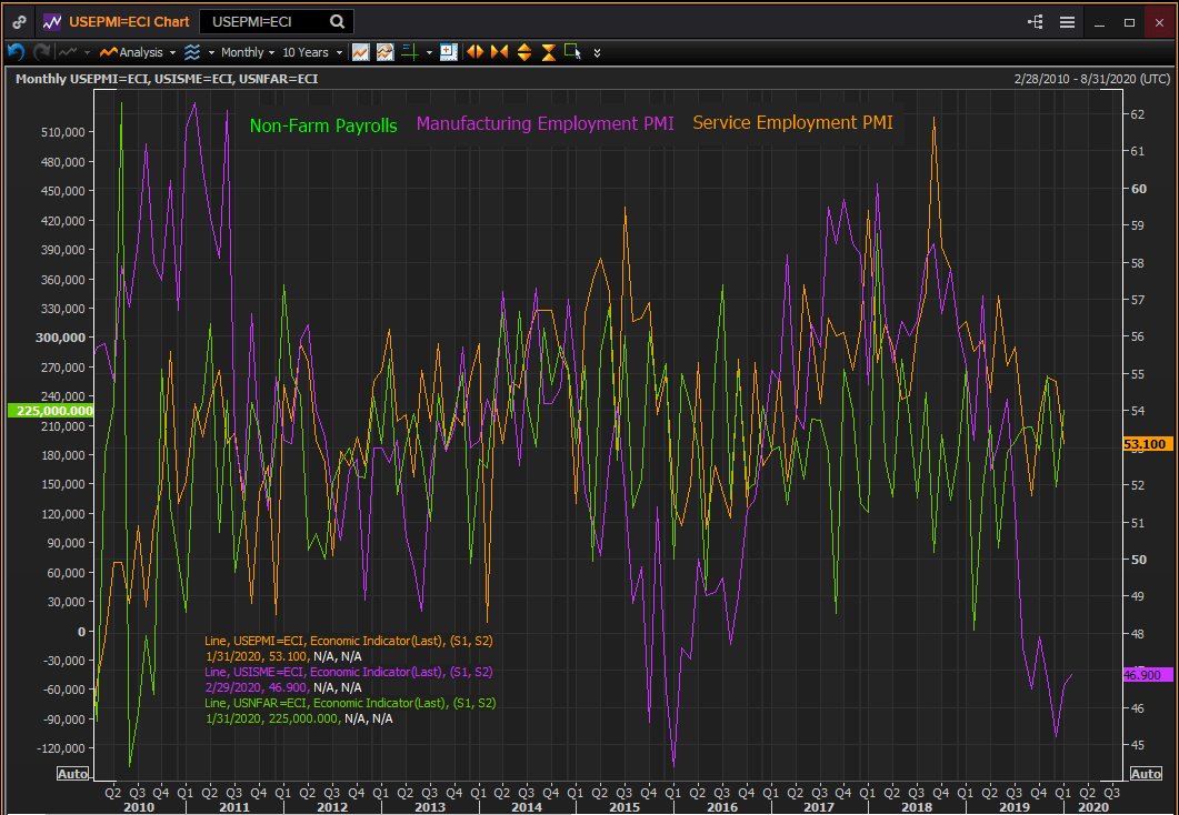 The trade war and Brexit threats to US employment, except in manufacturing, never materialized. Purchasing managers’ indexes for January and February in the factory sector indicate that damage from the viral problem has not yet made managers change their outlook substantially.