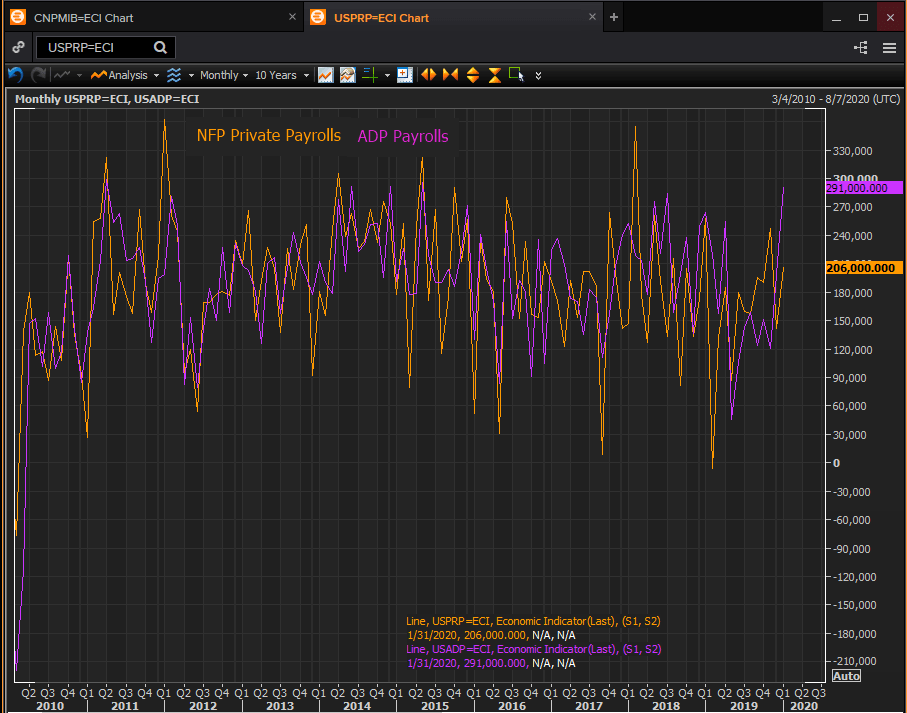 The ADP Employment Change Report is the closet match for the Employment Situation Report from the Bureau of Labor Statistics (BLS). It is essentially a limited version of the NFP private payrolls measure. The chief difference between the overall NFP figures and the ADP measure is the inclusion of local, state and federal government employment in the BLS information.