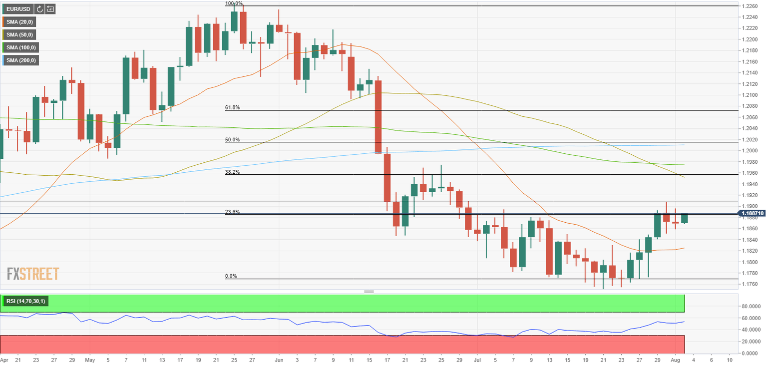 On the flip side, a strong ADP print could cause EUR/USD to turn south, at least with the initial reaction. On the downside, 1.1820 (20-day SMA) aligns as the first technical support ahead of 1.1800 (psychological level) and 1.1760 (static level, the ending point of the downtrend).