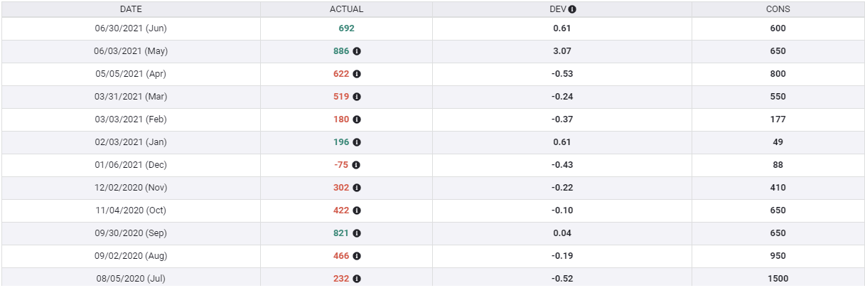 Earlier in the month, the preliminary Services PMI report published by the IHS Markit showed that the service sector was struggling to attract investors. "The rate of job creation was strong overall but softened amid challenges enticing workers back to employment," the publication read. On a positive note, the Employment Index of the ISM's Manufacturing PMI improved 52.9 from 49.9 in June.