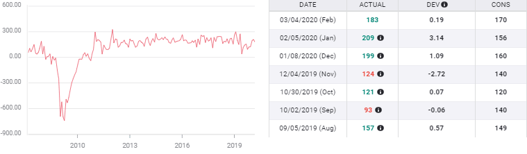 The shock to US labor markets in March from the Coronavirus induced layoffs will find its first, if partial expression from the ADP figures as the US job expansion, the longest on record comes shuddering to a halt. Private payrolls last had a negative month in October 2010.