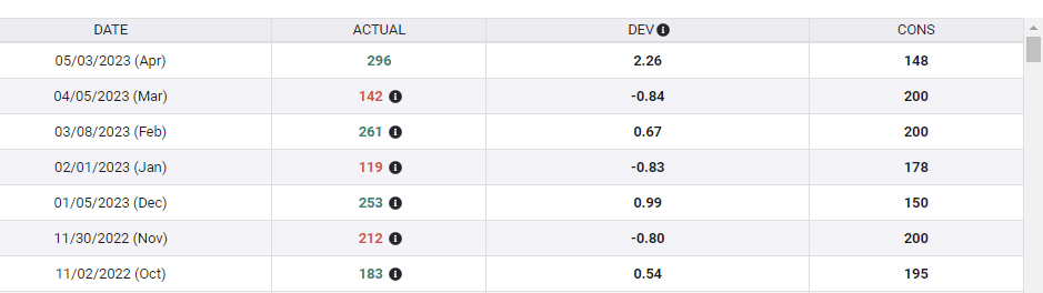 Not only have ADP's figures jumped from miss to beat and the other way around, but these differences have also been significant, especially in recent months. After leaping to the highest level since July 2022 in the latest April publication, the upcoming May report could be weak.