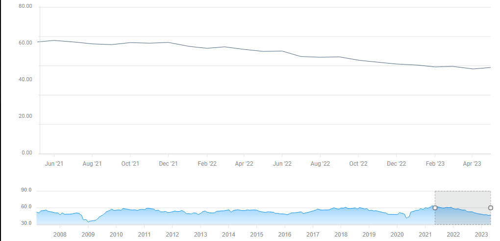 The calendar points to stability in May – a minor drop from 47.1 to 47. Estimates for the employment component are more pessimistic, pointing to a drop from 50.2 to 48.5 points. That also allows for an upside surprise in the figure that matters for the Nonfarm Payrolls report.