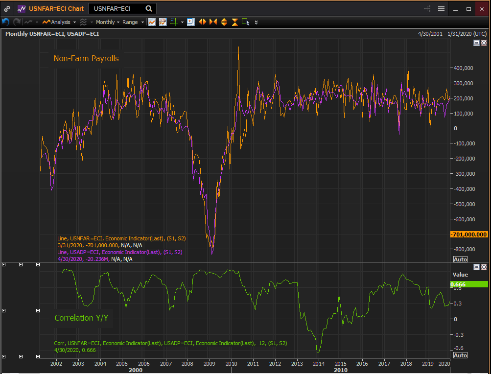 The ADP April forecast was extrapolated from initial claims data and did not suffer from the informed guesswork of the first two coronavirus estimates for March 20 and 27. The consensus prediction for the NFP number on Friday should have the same accuracy. With variations for the different categories and criteria used, the ADP, NFP and claims numbers are all packaging the same information.