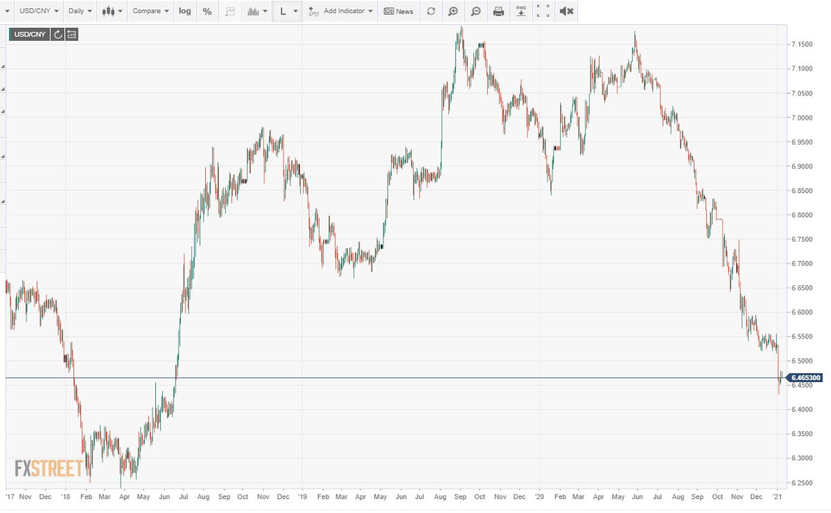 Since that peak, the USD/CNY has fallen steadily closing at 6.4618 on January 6, a 9.9% decrease from the most recent high of 7.1693 on May 27.
