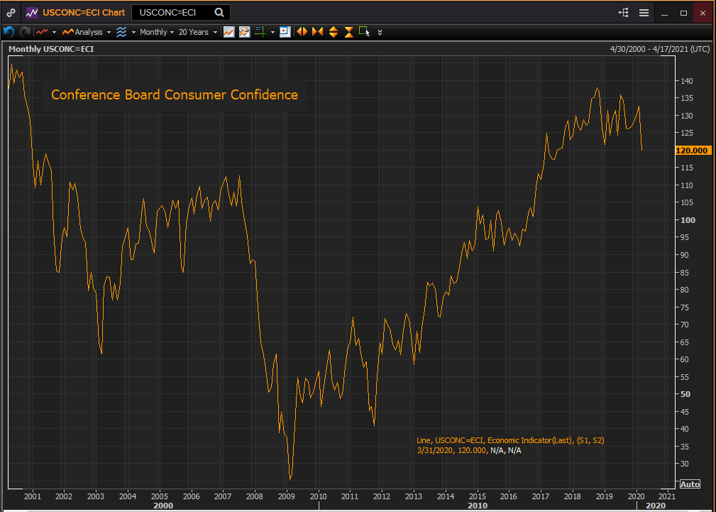 Consumer confidence from the Conference Board is expected to fall 40 points in April its largest one month decline in the series history. The plunge to 80 from 120 in March comes as 26.4 million people have lost their jobs in the last five weeks, 16% of the labor force, idling an unknown portion of the US economy. Another 3.5 million people are expected to file for jobless benefits this week, bringing the total in six weeks 30 million.
